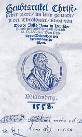Die meist sehr gut lateinisch sprechenden Studenten aus Ungarn nahm Melanchthon teilweise in seinem eigenen Haus auf und ließ sie am häuslichen Unterricht und am Familienleben teilnehmen. Deutsch konnten sie fast nie, so daß sie nur mit großen Schwierigkeiten dem deutschsprachigen Gottesdienst folgen konnten. Der Überlieferung nach hat Melanchthon besonders für die Ungarn an jedem Sonntag bei sich zu Hause die Bibel ausgelegt. Dann wurde das Haus zu eng, da Melanchthons lateinische Sonntagsvorlesungen überaus beliebt waren. In Ungarn avancierte Melanchthon zum meist gedruckten ausländischen Autor. Vor allem seine Schriften zum Abendmahl wurden häufig aufgelegt, da in Ungarn sowohl Lutheraner als auch Reformierte großen Einfluß besaßen. Aber auch die griechische und lateinische Grammatik, eine Studienordnung und sogar eine Gedichtsammlung haben den Unterricht an ungarischen Schulen bereichert. Neben der Schule wurde Melanchthons Einfluß in der Kirchenorganisation bedeutsam; so bildete auf der am 20. September 1545 in Erdöd abgehaltenen Synode die von Melanchthon verfaßte "Confessio Augustana" die Grundlage der Diskussionen und Beschlüsse. Philipp Melanchthon, Heubtartikel Christlicher Lere Wittenberg: Veit Kreutzer, 1558, die erste deutsche Theologie Melanchthons, die 1559 im damaligen Oberungarn gedruckt wurde |