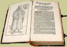 Der Holzschnitt aus der Cranach-Werkstatt zeigt den gealterten Melanchthon, links Cranachs Künstlersignatur, die geflügelte Schlange und Jahreszahl, rechts Melanchthons Wappen.