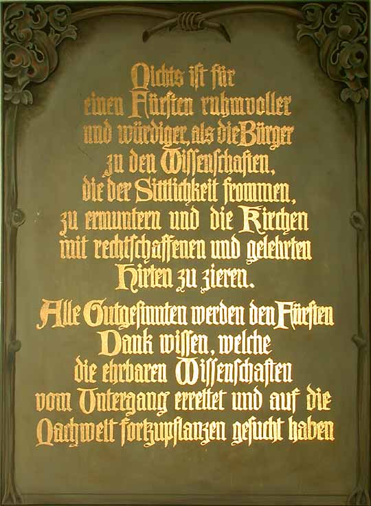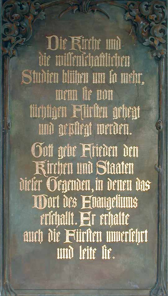 An den Wänden sind sentenzartige Aussprüche Melanchthons über den Beruf und die Pflichten der Fürsten angebracht. An der linken Ostwand: