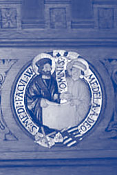 Wappensiegel der juristischen Fakultät mit dem Heiligen Ivo als deren Schutzpatron und Wappensiegel der medizinischen Fakultät, deren Schutzherren St. Cosmas und St. Damian waren.