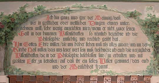 An den Bücherschränken findet sich ein weiteres Zitat Melanchthons, das sich an die Wissenschaftler allgemein richtet: