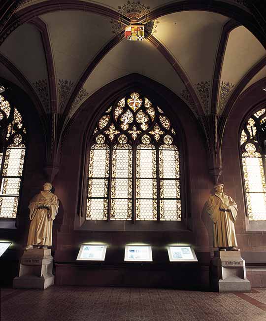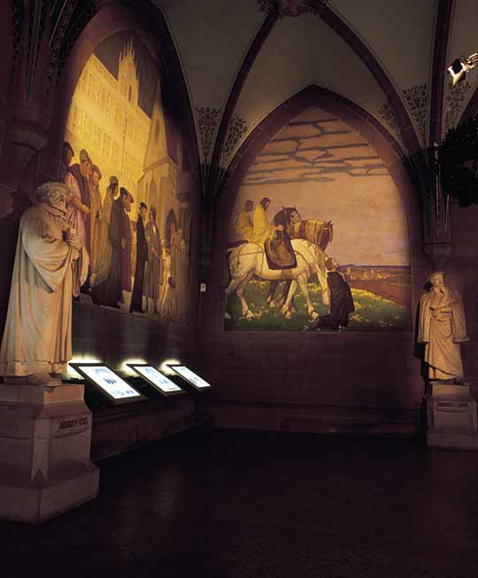 Eine sinnvolle Akzentuierung der wesentlichen Exponate der Gedächtnishalle geschieht ebenfalls mit Licht. Mit Hilfe einer ausgeklügelten Lichtdramaturgie werden die den Raum prägenden Wandgemälde sowie die überlebensgroßen Reformatoren-Standbilder und weitere ikonografische Besonderheiten des Raumprogramms in Szene gesetzt.