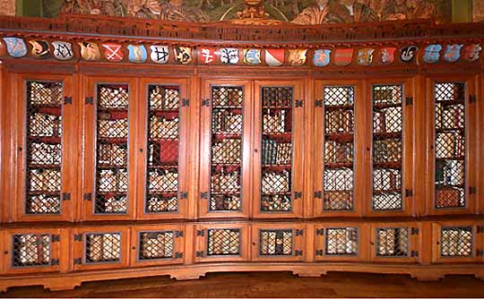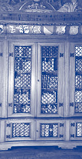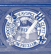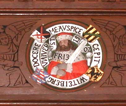 Über der gegenüberliegenden Tür befindet sich das Wappensiegel der Theologischen Fakultät in Wittenberg, mit der Figur des Heiligen Augustin im Bischofsornat und seinem Attribut, einem durchbohrten Herzen.