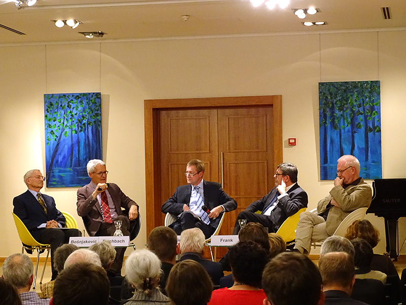 Die anschließende Podiumsdiskussion stand unter dem Thema „Grenzen überwinden in Europa – Was können wir im Hinblick auf Europa und die Europäische Union von Philipp Melanchthon und seinen Zeitgenossen lernen?“ Die Diskussionsteilnehmer waren (v.l.n.r.) Prof. Branko Bosnjakovic (Wien), Naturwissenschaftler und Umweltdiplomat, Frank-Dieter Fischbach, Exekutivsekretär der Konferenz Europäischer Kirchen, Eyke Peveling, Prof. Günter Frank, Dr. Albert de Lange (Karlsruhe), Kirchenhistoriker.