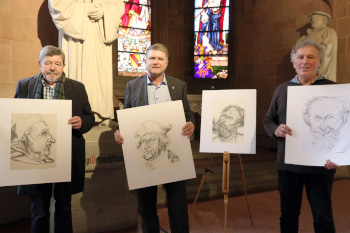 Im Melanchthonhaus übergab (v. r.) der Künstler Karl Vollmer seine zeitgemäßen Reformatorenbildnisse an Prof. Dr. Günter Frank, Direktor der Melanchthon-Akademie, und Oberbürgermeister Martin Wolff. (Foto: Ellen Reinold/Stadt Bretten) |