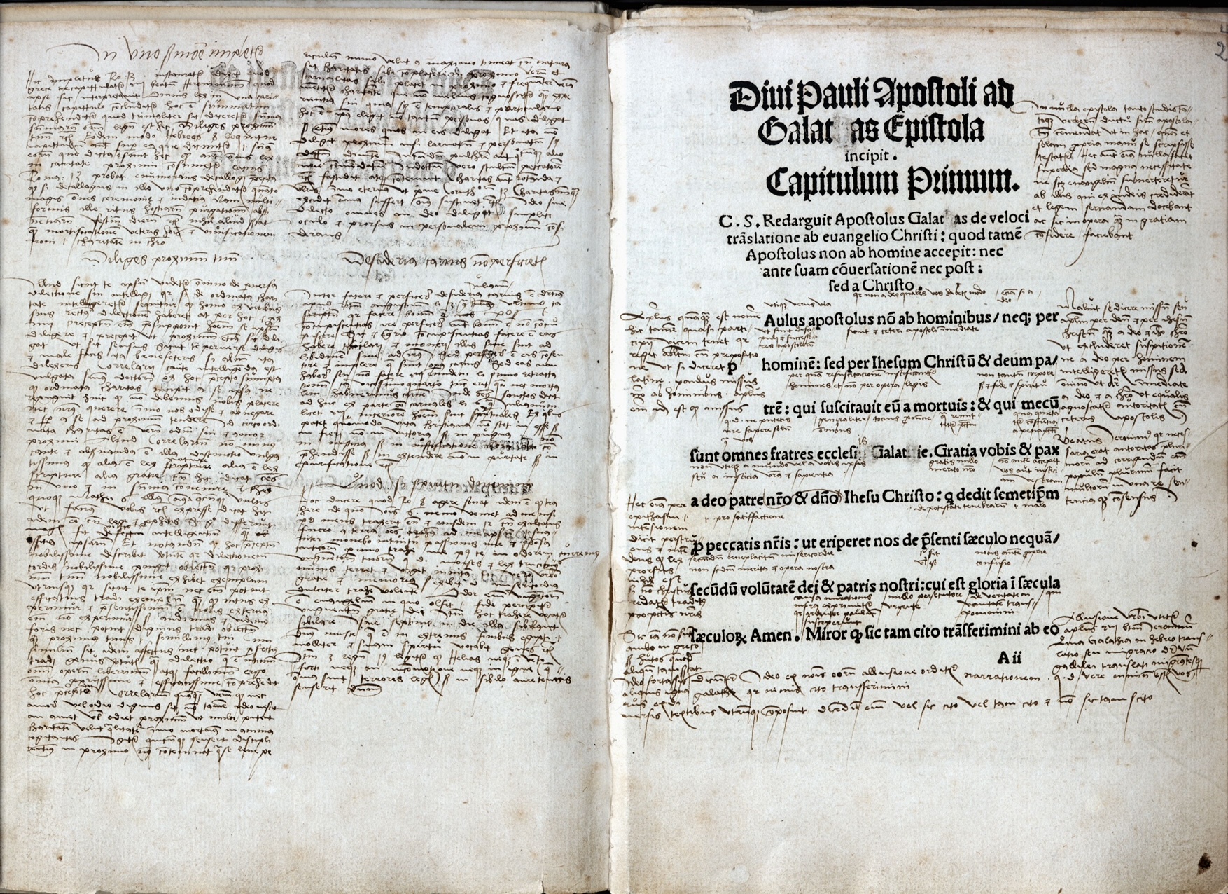 Eine Ausgabe des Galaterbriefes mit einer studentischen Nachschrift aus dem Jahr 1516/1517 ist eine überaus wertvolle Kostbarkeit in der Bibliothek des Melanchthonhauses. Beim Galaterbrief - oder genauer: dem Brief des Apostels Paulus an die Galater - handelt es sich um ein Buch des Neuen Testaments.Martin Luther hat über den Galaterbrief Vorlesungen gehalten. Für seine erste Vorlesung ließ er den Text absichtlich mit weiten Zeilenabständen und breiten Seitenrändern drucken, damit die Studenten in diesem Text handschriftliche Notizen (Glossen) eintragen konnten. Ein unbekannter Student hat diese Ausgabe tatsächlich als Grundlage für die Vorlesung Luthers benutzt und mit Notizen nach Luthers Diktat versehen.